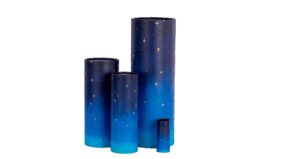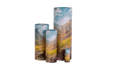 Our collection of exclusive Scatter Tubes is available in ten beautiful designs: Woodland, Meadow, Beach, Autumn, Mountains, Green Verdant, Pink Skies, Starry Nights, Blue Cascade, and Golden Tide. Each design is available in four sizes: Keepsake, Small, Medium and Large.